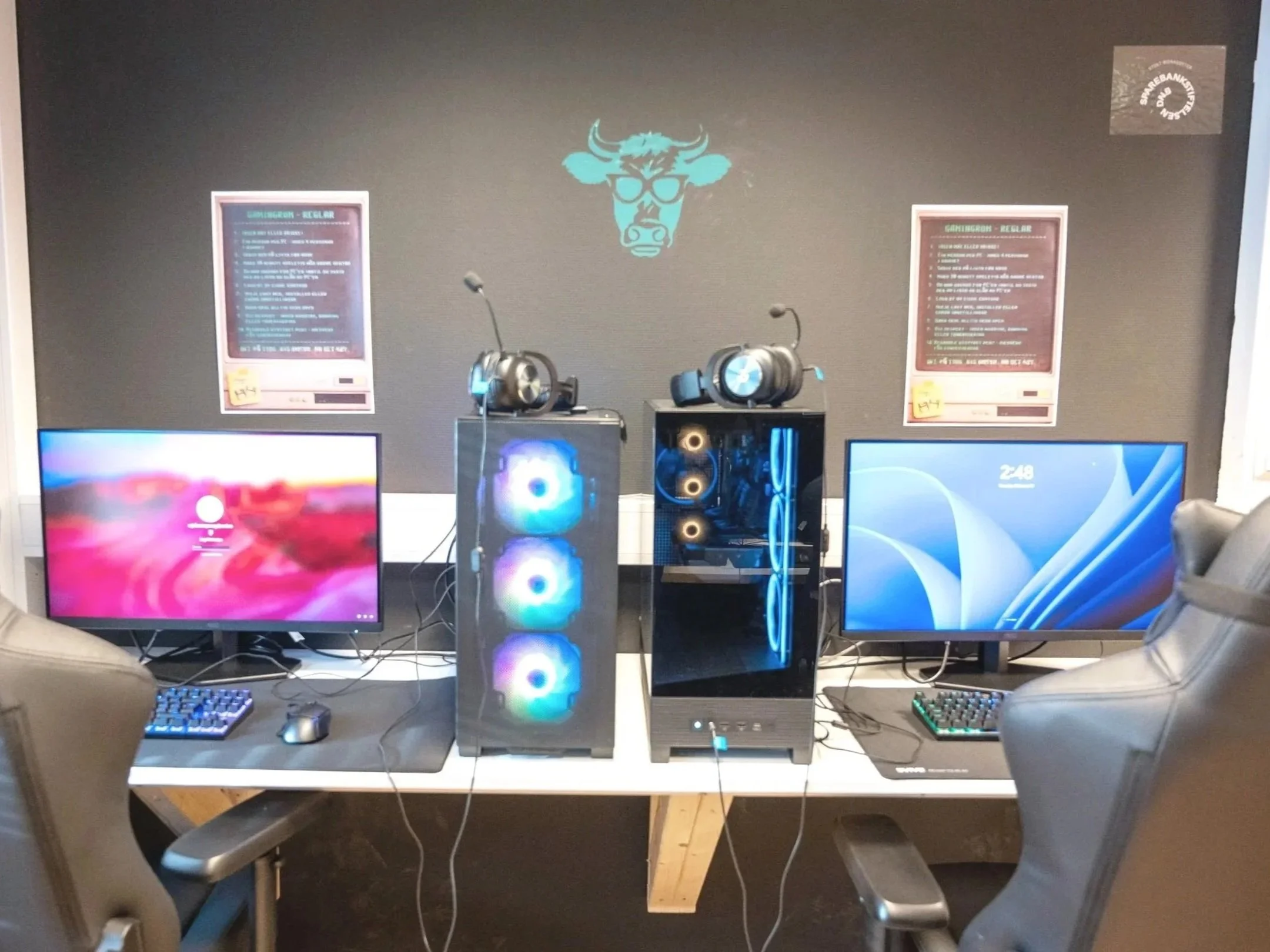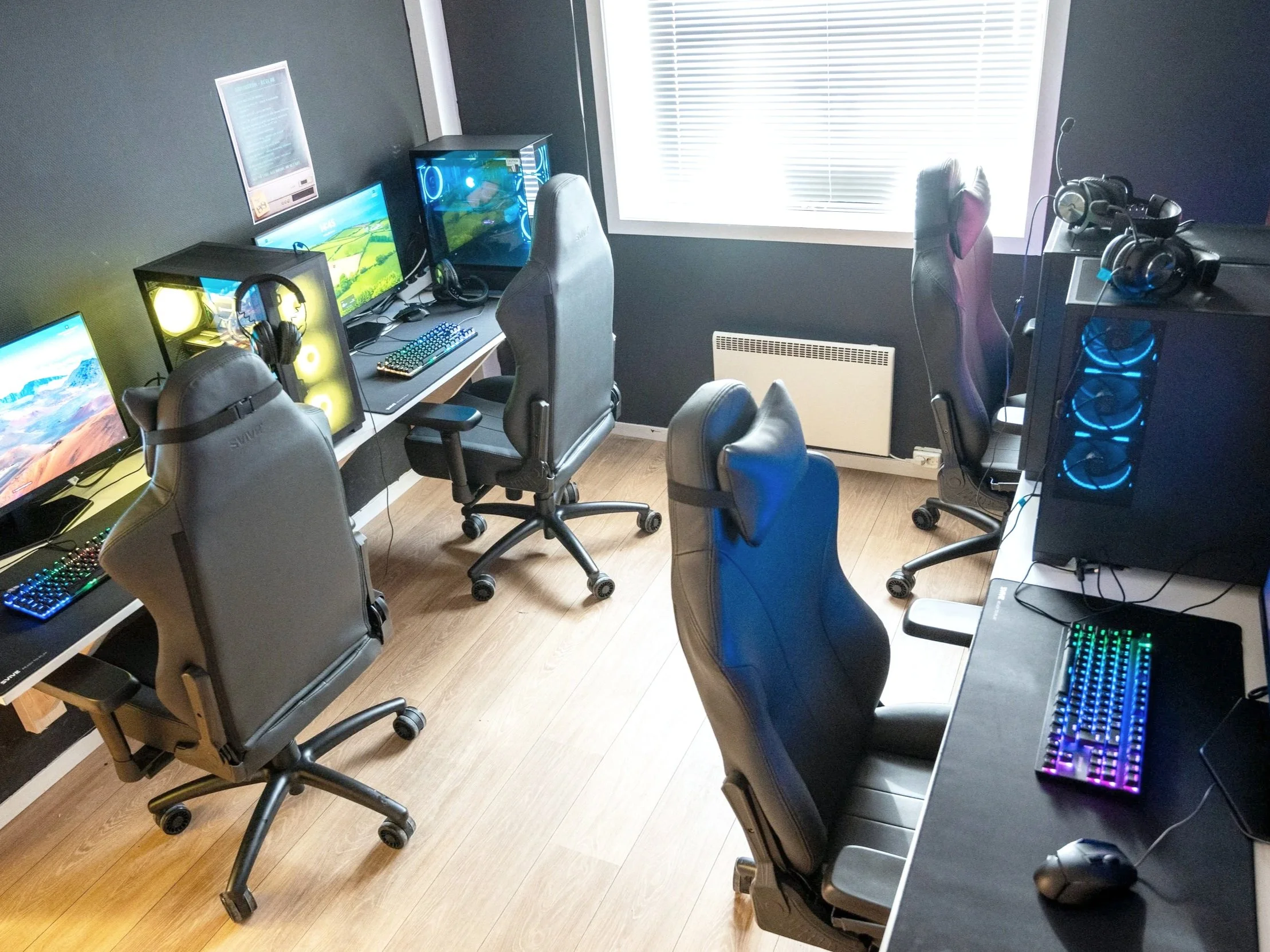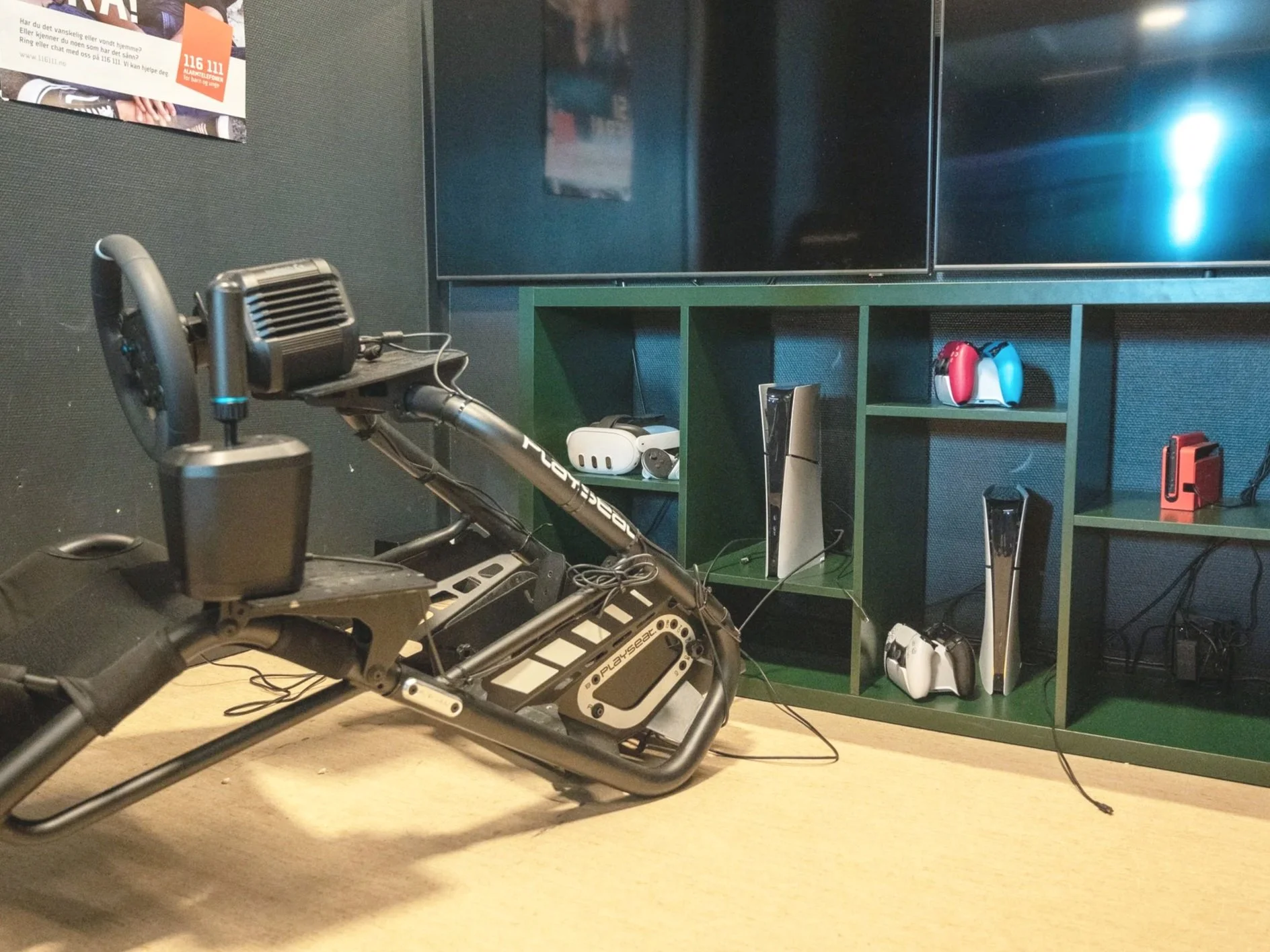 Vi har to PlayStation-stasjonar, to Nintendo Switch-oppsett og eit gamingrom med fire kraftige PC-ar. I tillegg har vi VR-briller, to racingsete og simulatorar som gir realistiske og engasjerande spelopplevingar.