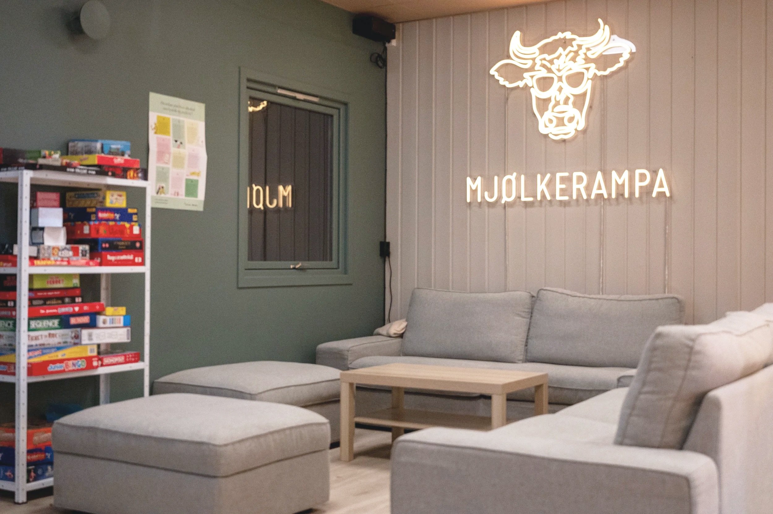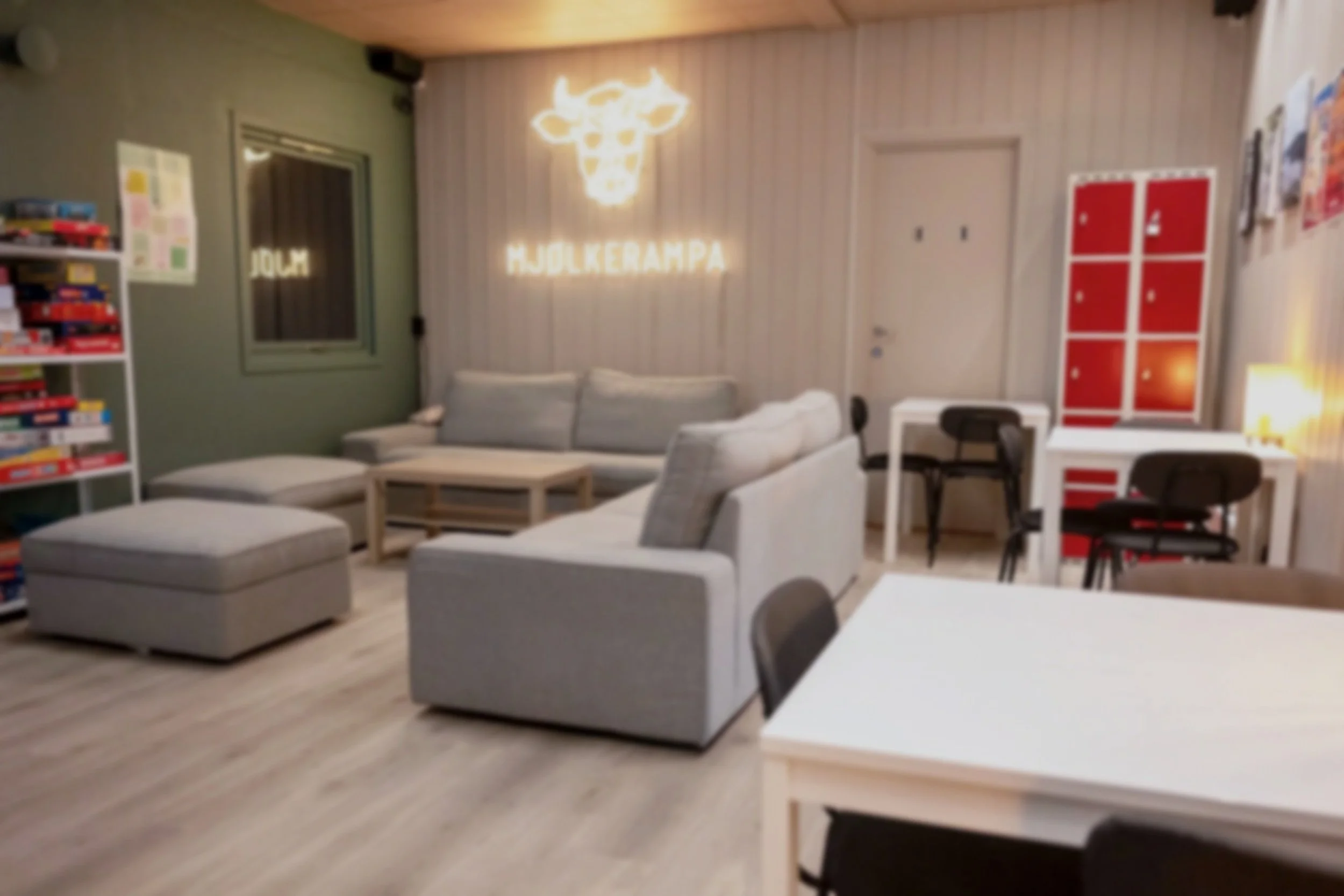 På Mjølkerampa finn du fleire loungeområde som er spreidde rundt i huset. Her er det sofagrupper og sitjeplassar der ungdom kan slappe av, prate, bruke telefonen eller berre vere.